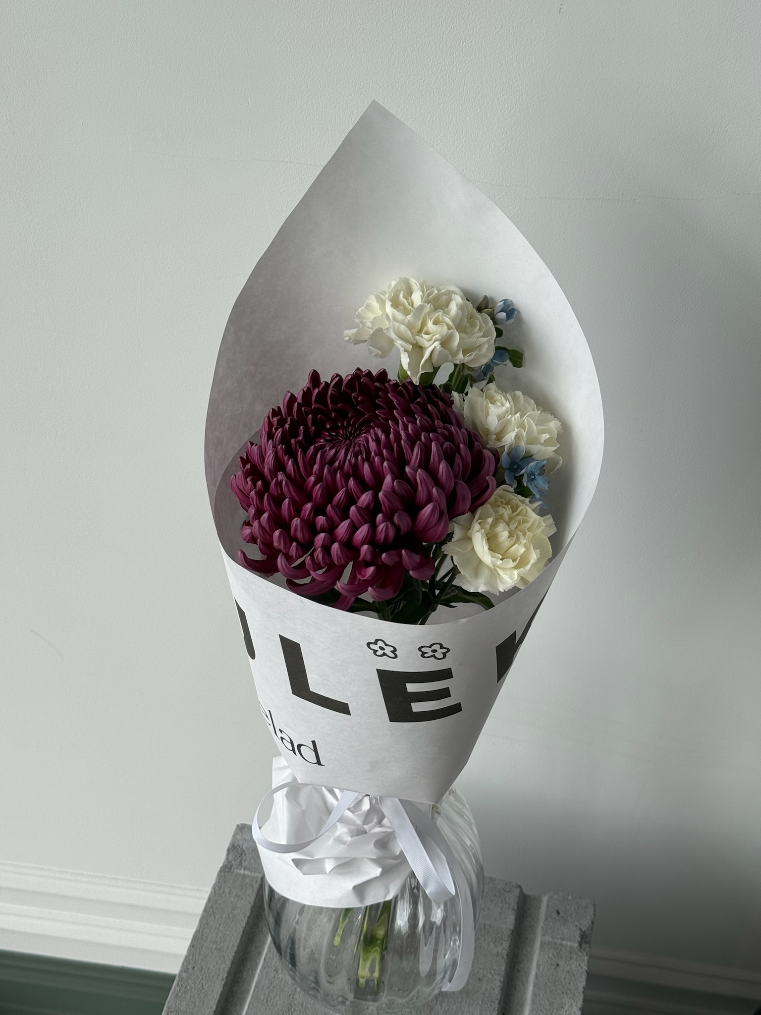 Кулек из одноголовой хризантемы, диантусов и оксипеталума