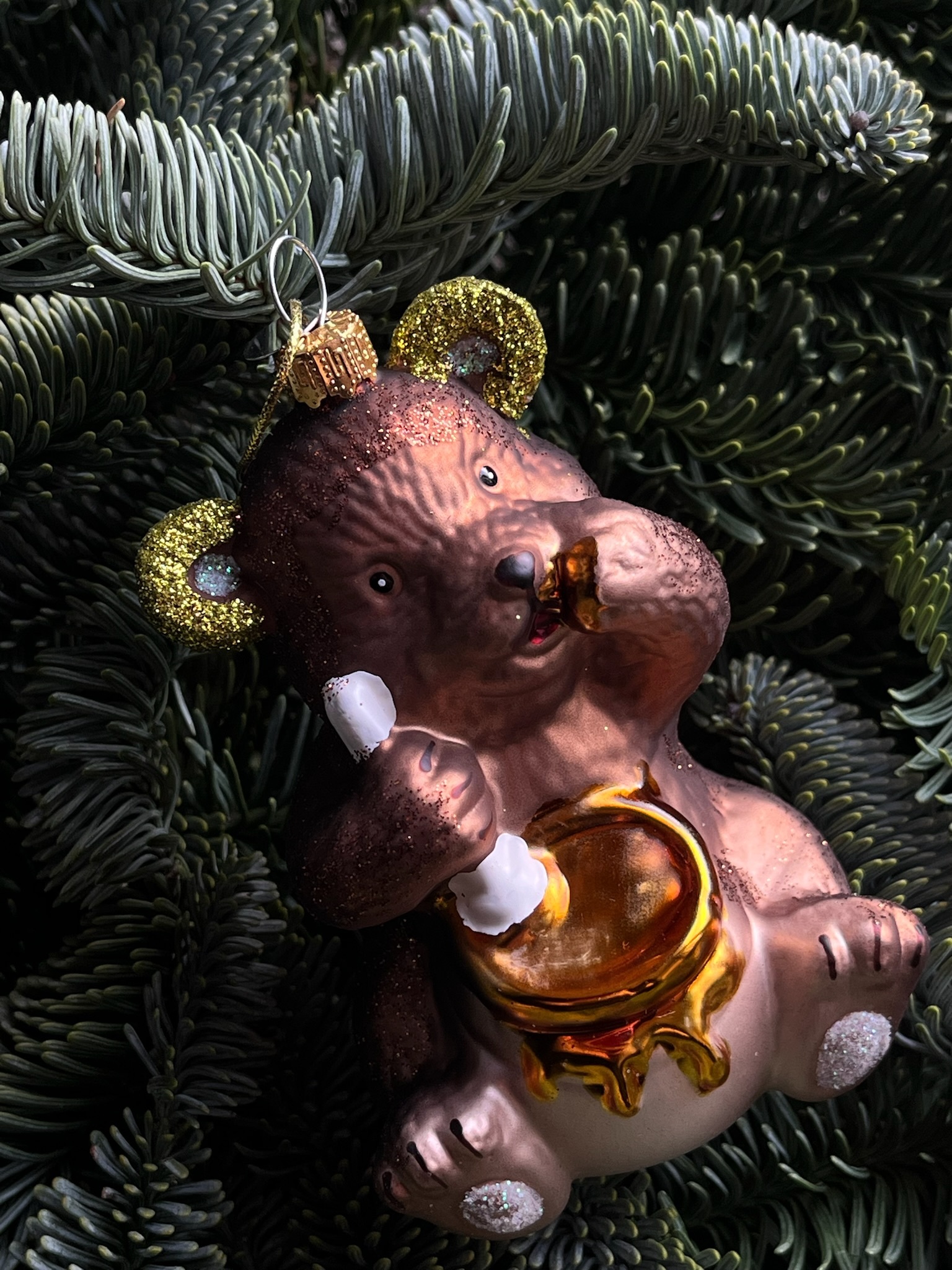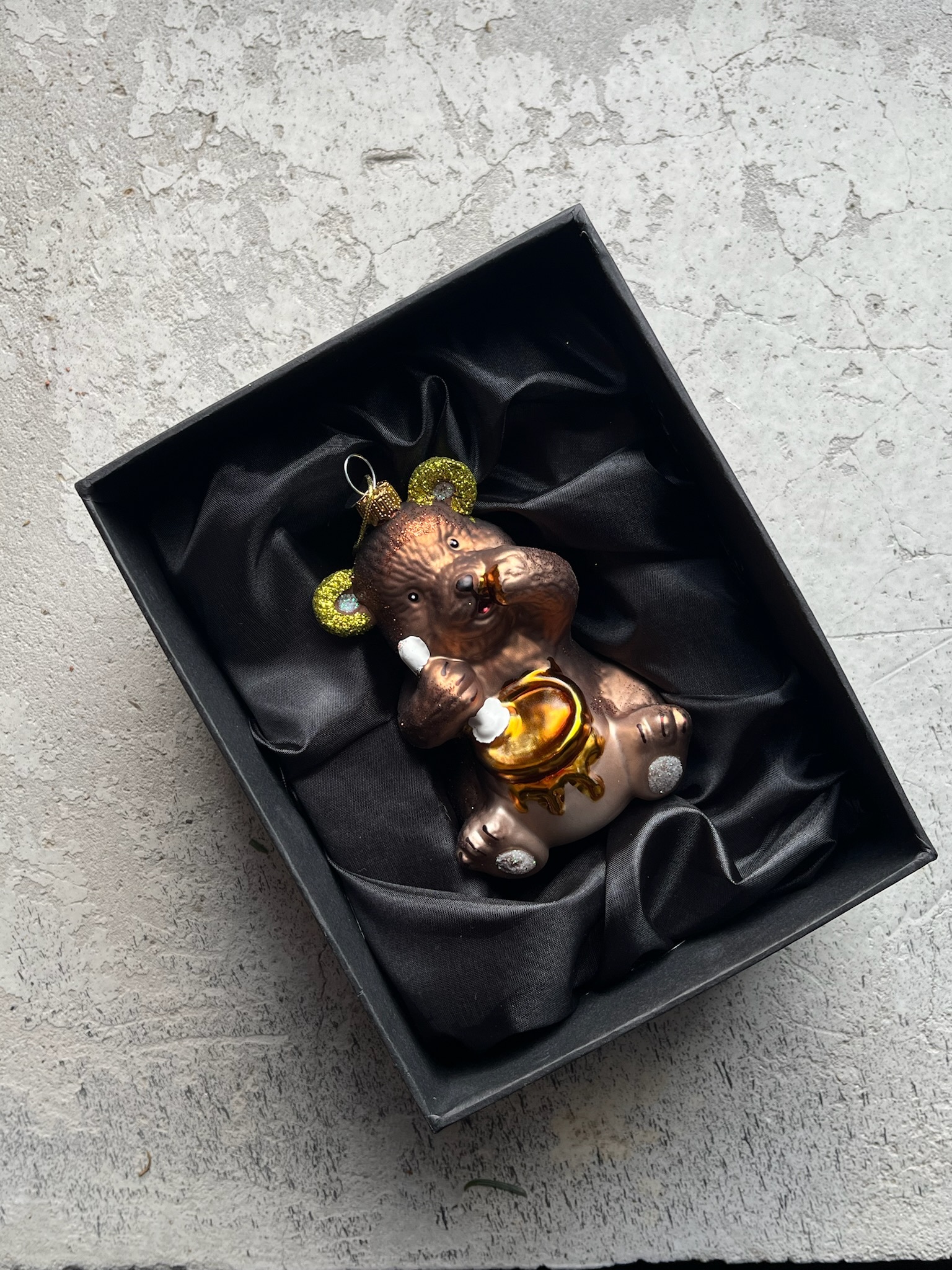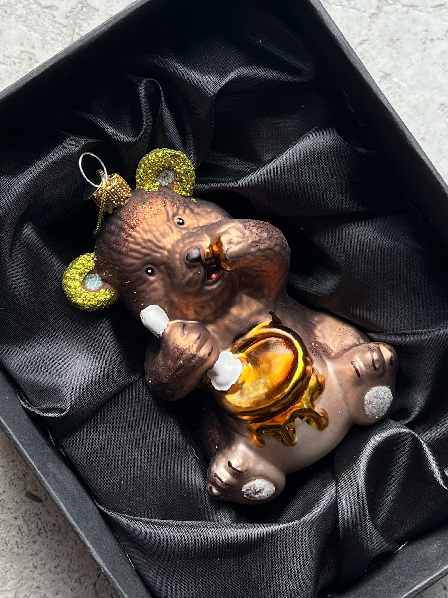 Новогодняя игрушка Мишка с бочонком меда стекло