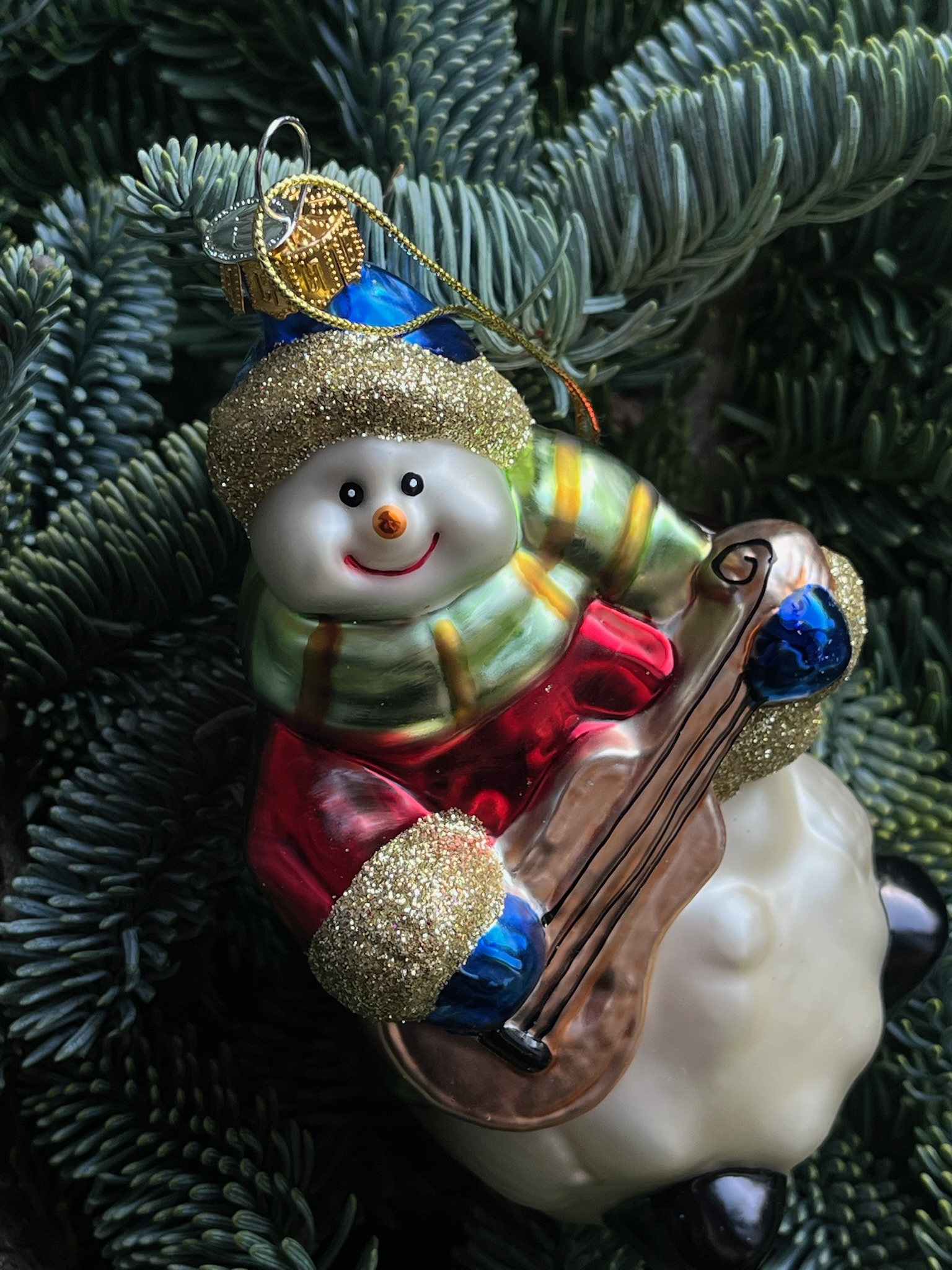 Новогодняя игрушка Снеговик музыкант с гитарой стекло