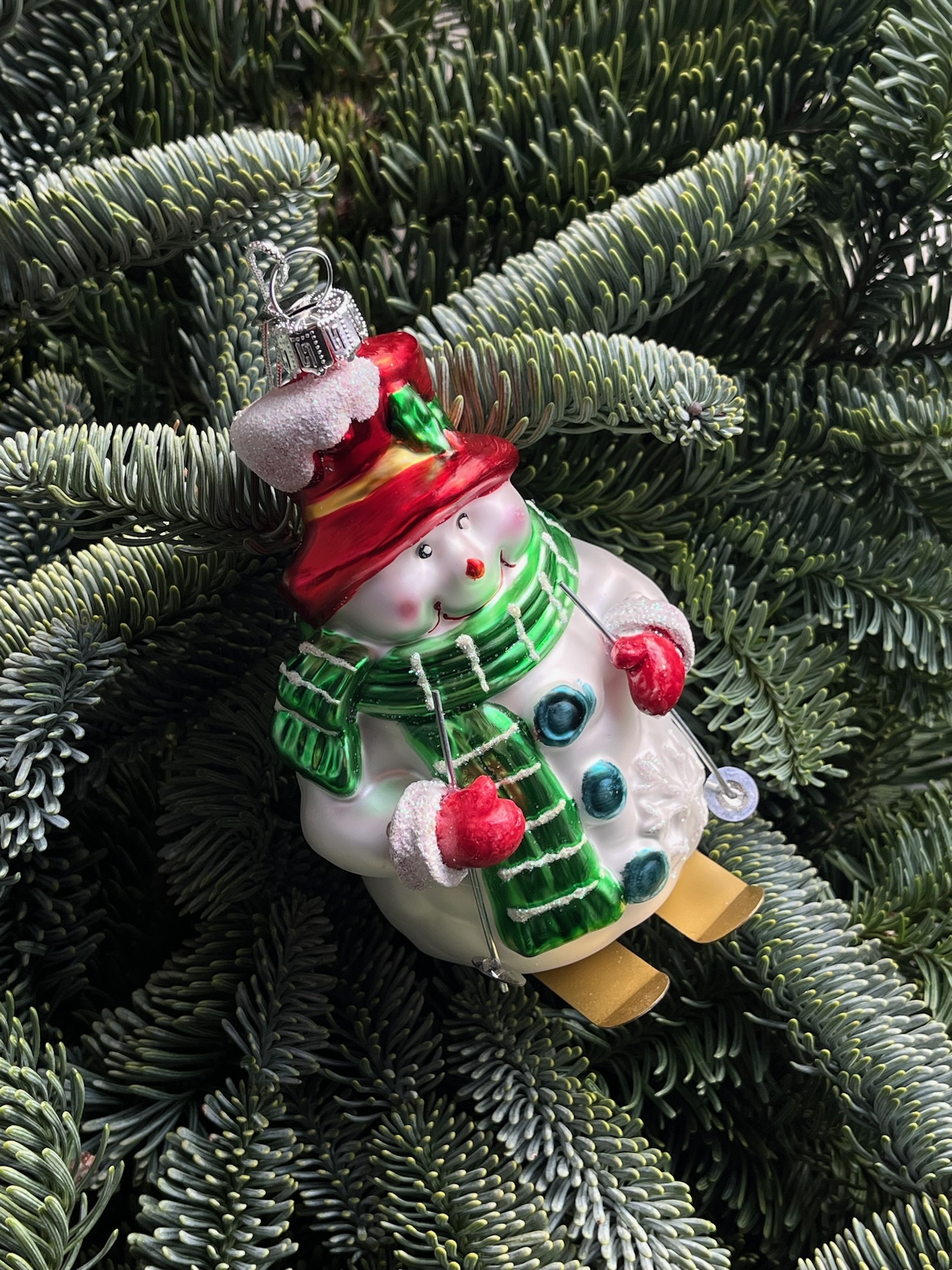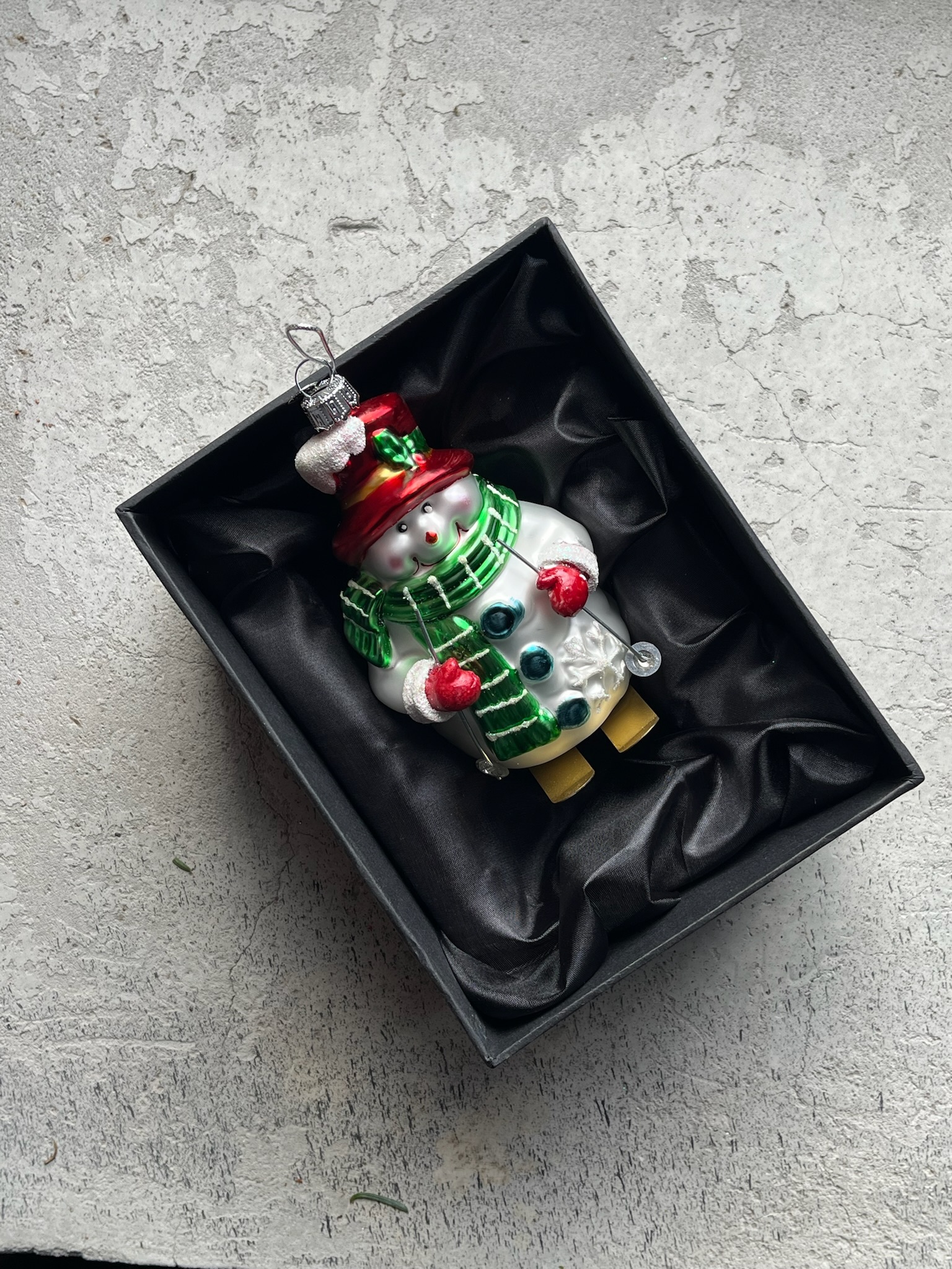 Новогодняя игрушка Снеговик в зеленом шарфике стекло