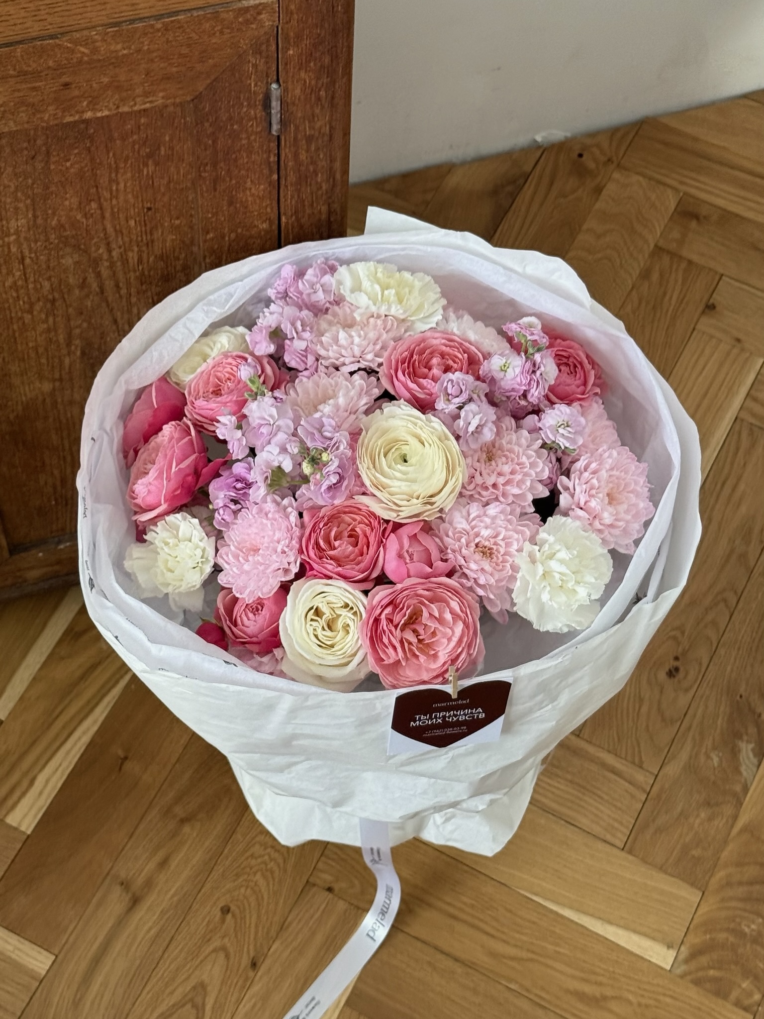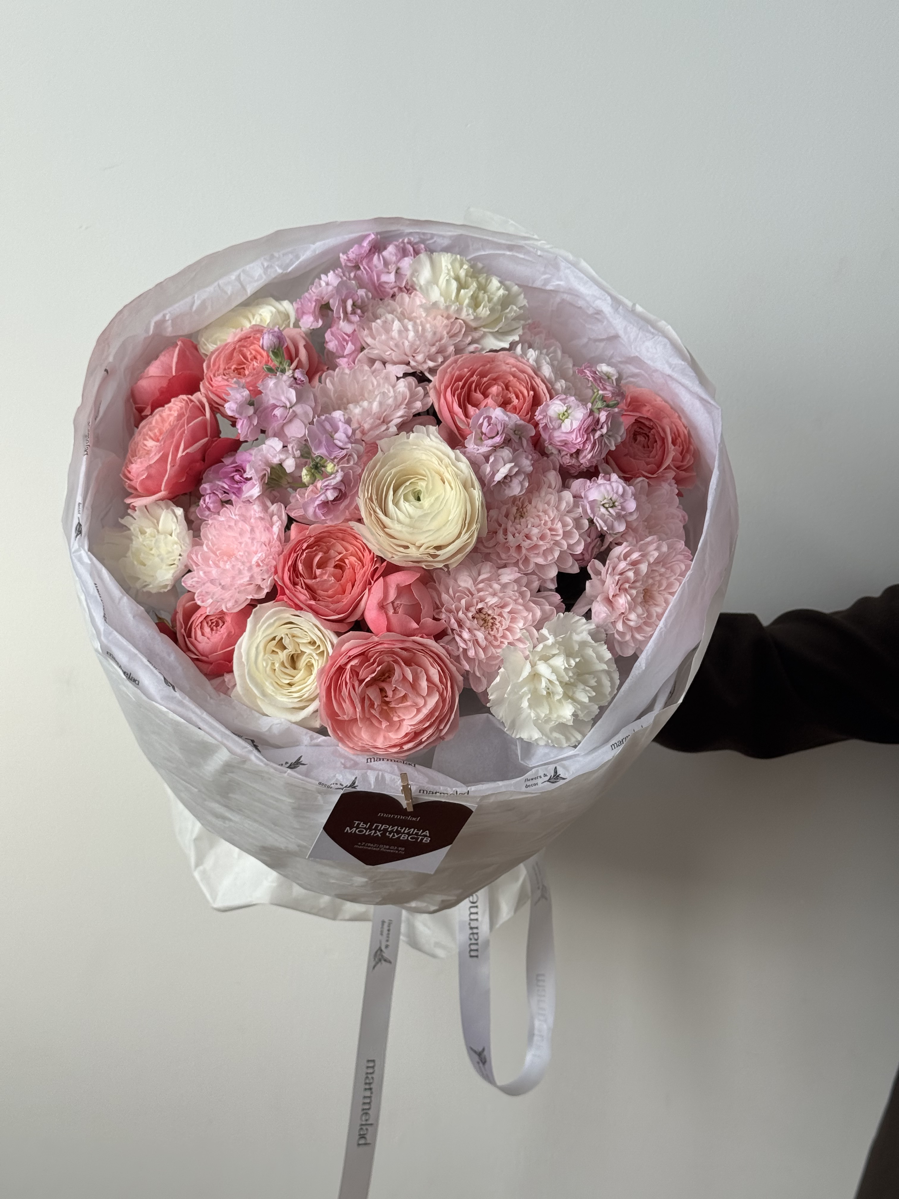 Сборный букет из хризантемы, маттиолы, кустовых пионовидных роз и диантусов - размер M