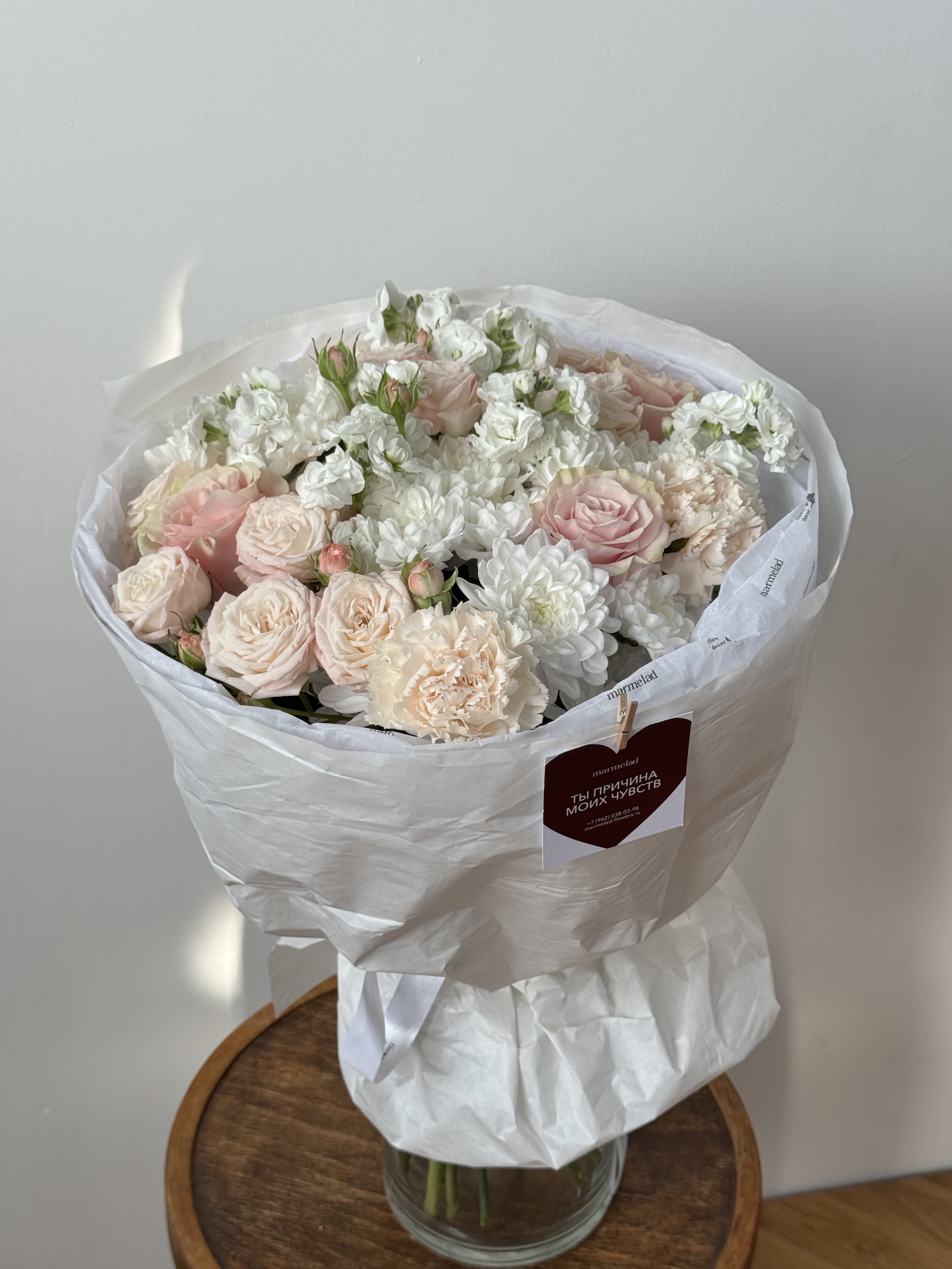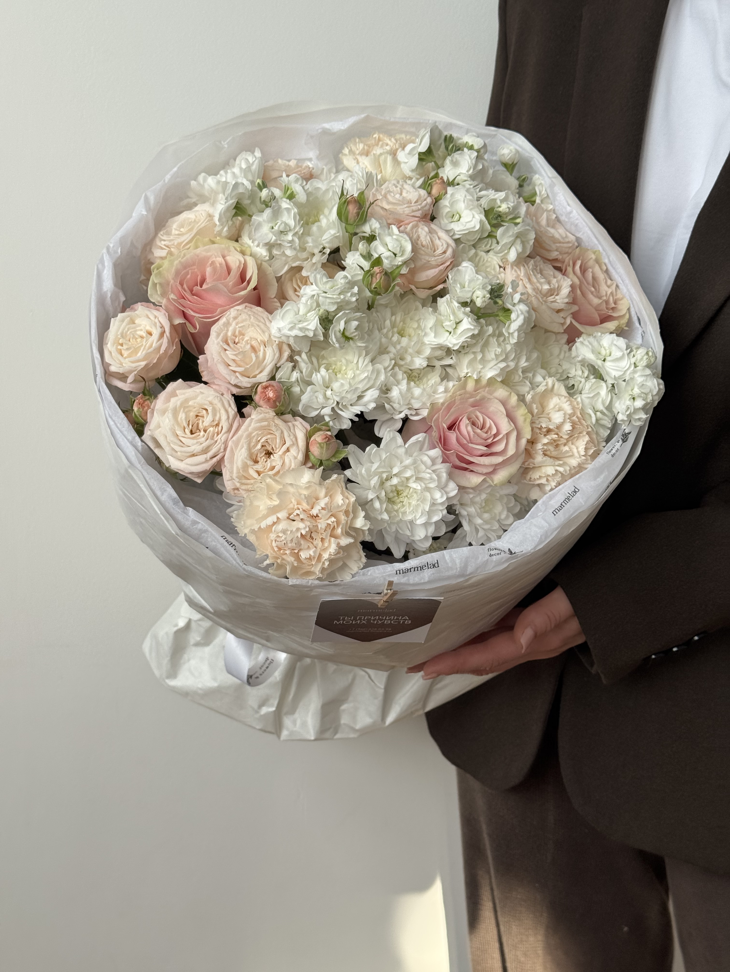Сборный букет из хризантемы, маттиолы, кустовых пионовидных роз и диантусов крем - размер M