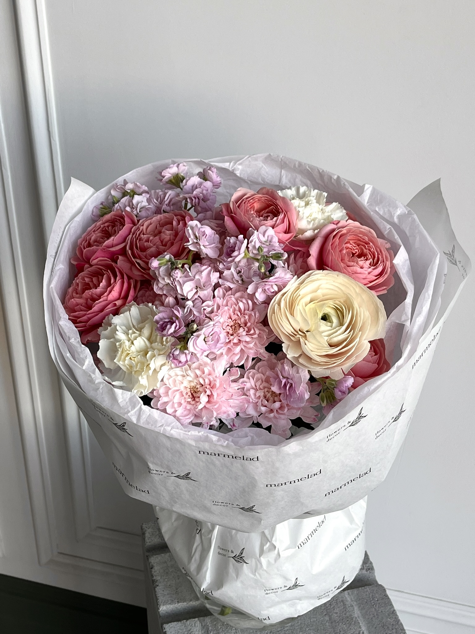 Сборный букет из хризантемы, маттиолы, кустовых пионовидных роз и диантусов роз - размер S