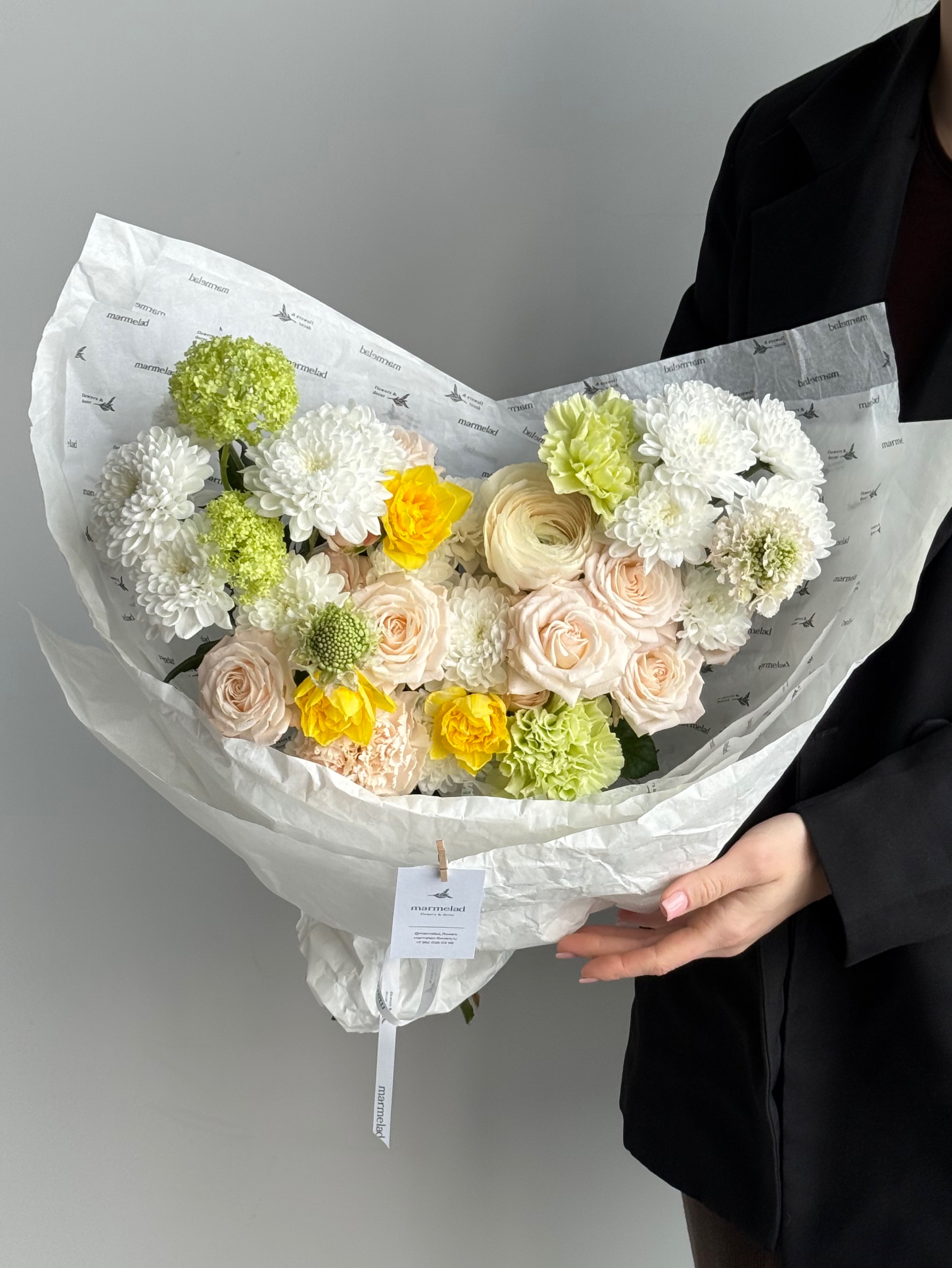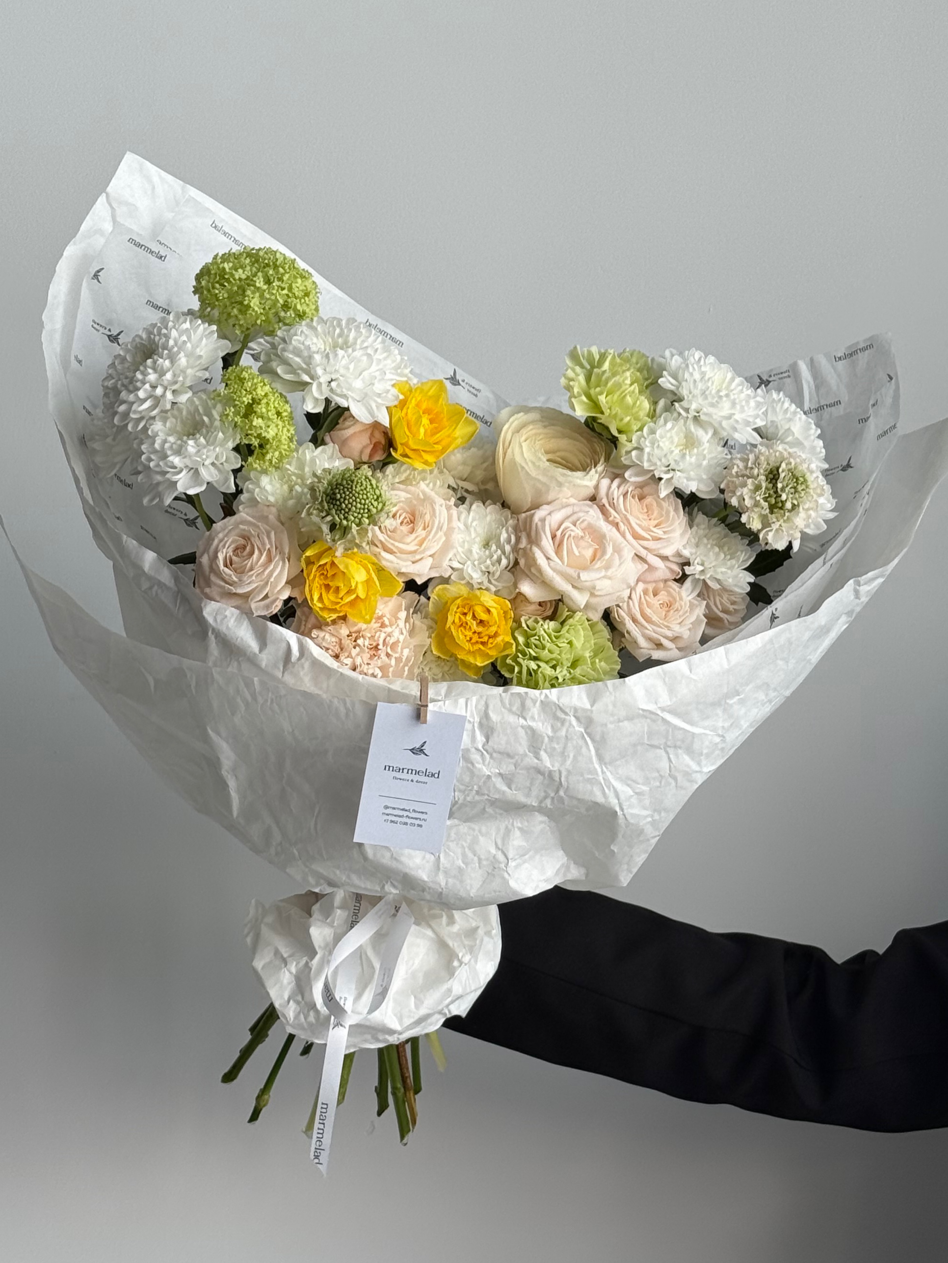 Сборный букет их хризантемы, нарциссов, вибурнума, кустовых пионовидных роз и ранункулюсов