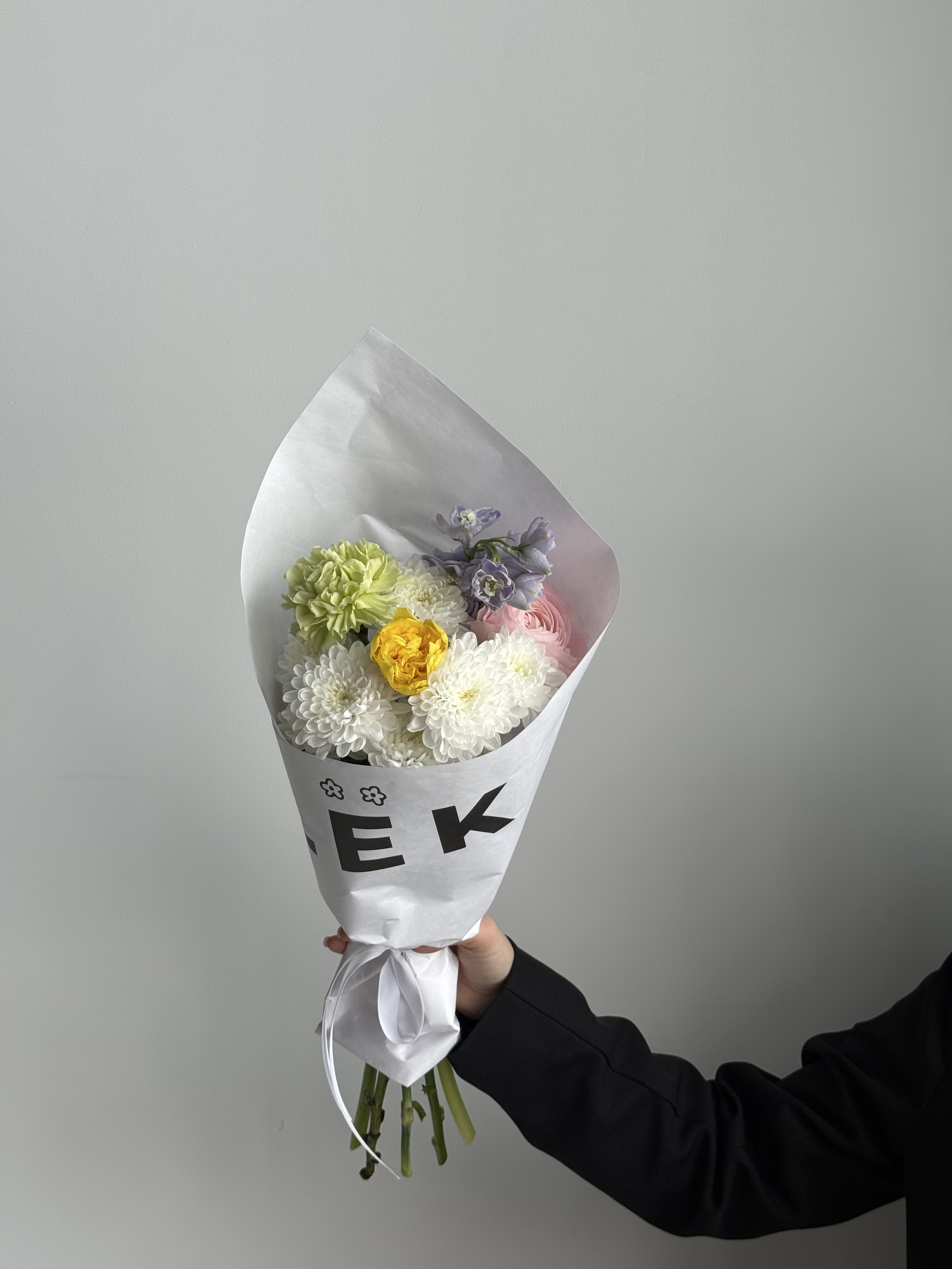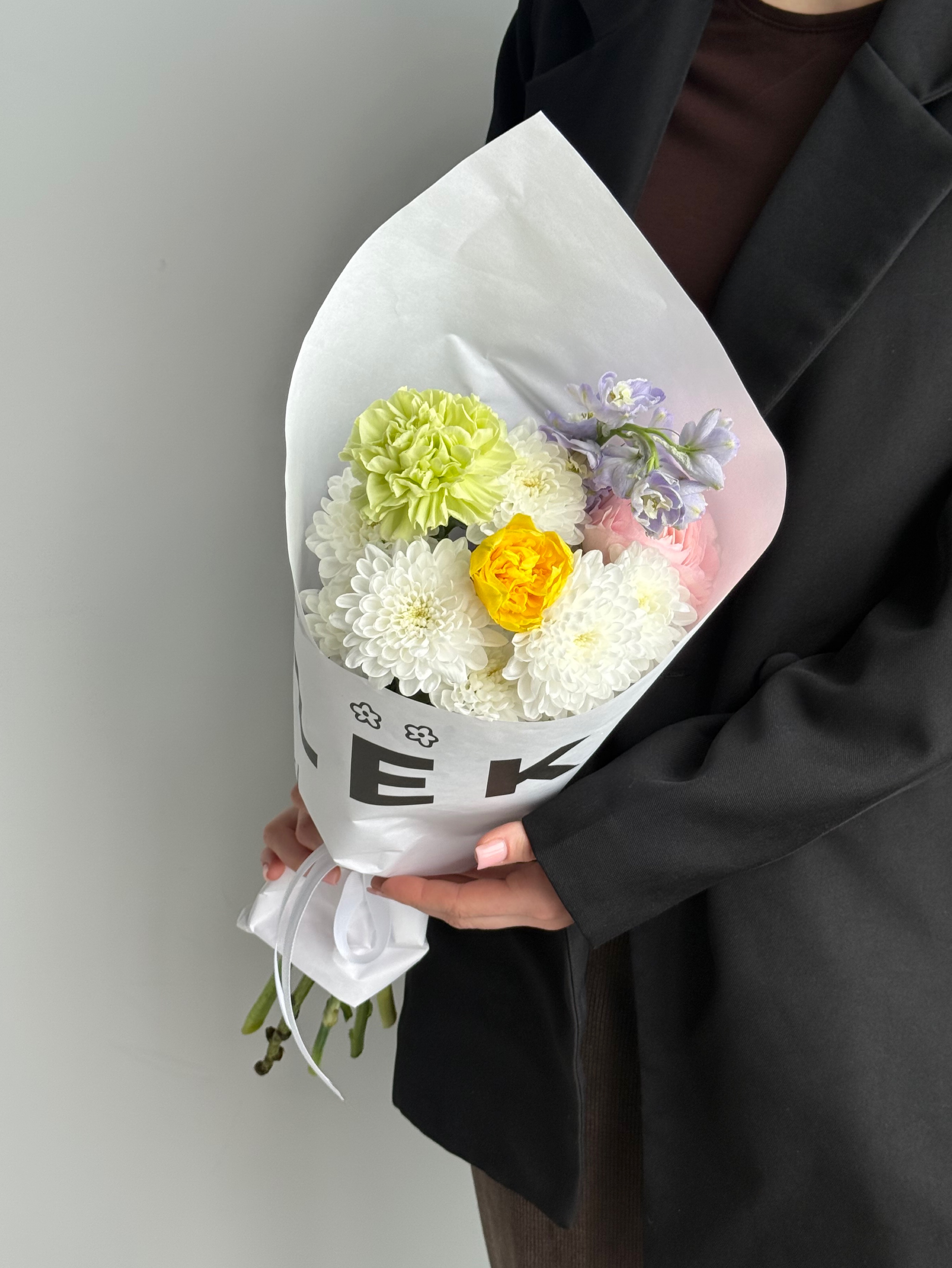 Кулек их хризантемы, диантуса, дельфиниума и ранункулюса