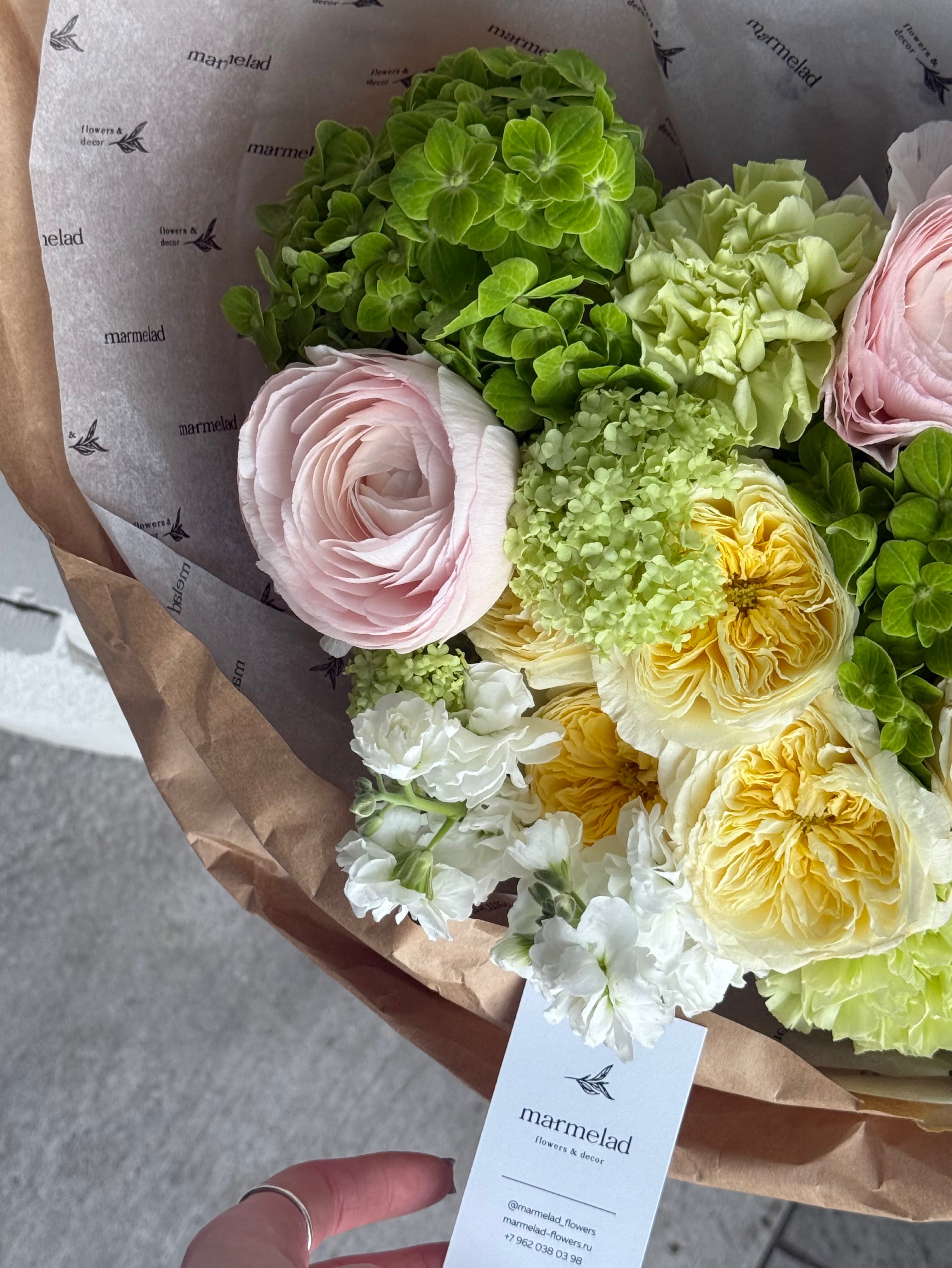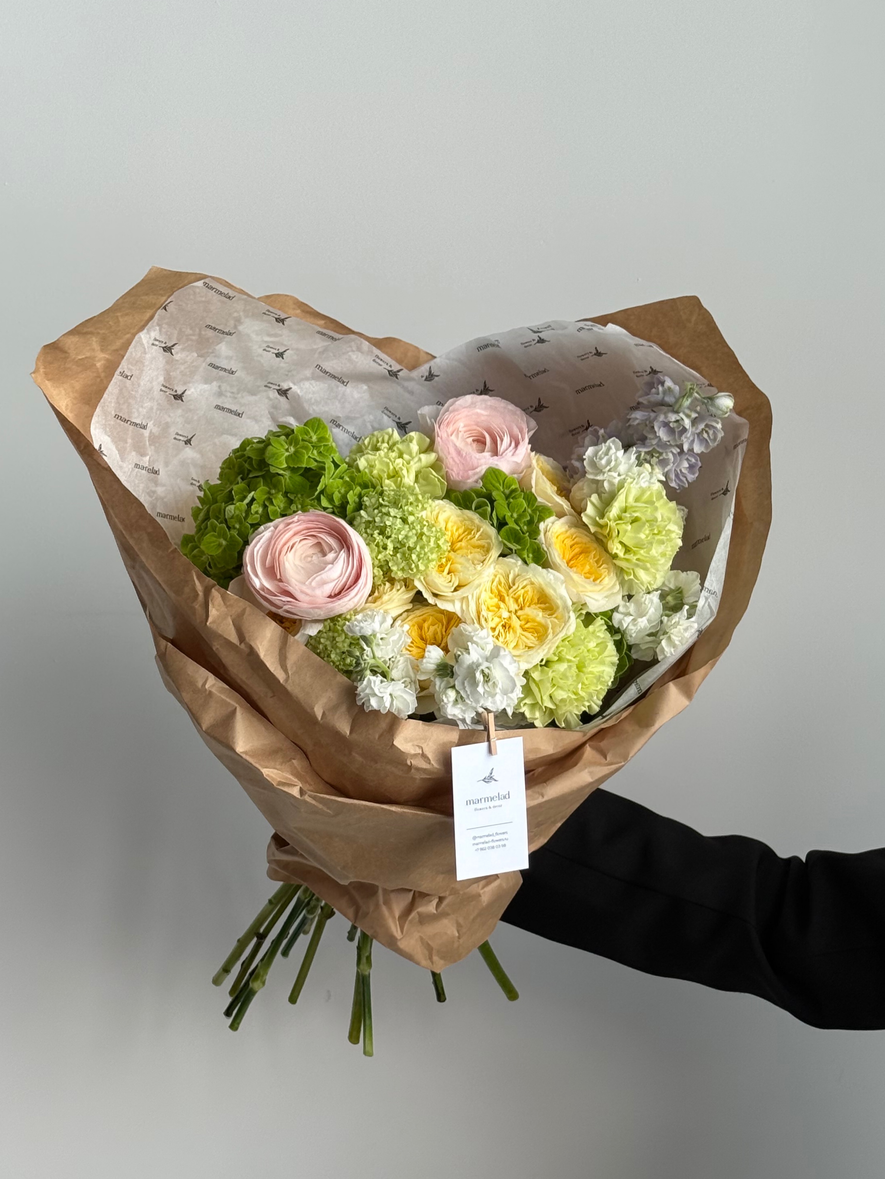 Сборный букет из гортензии, маттиолы, кустовых пионовидных роз, ранункулюсов и вибурнума