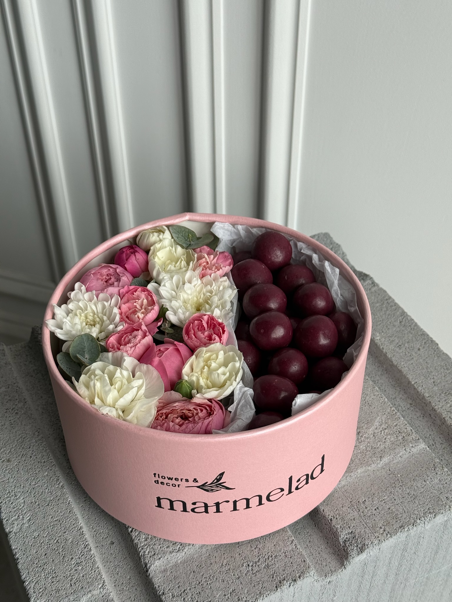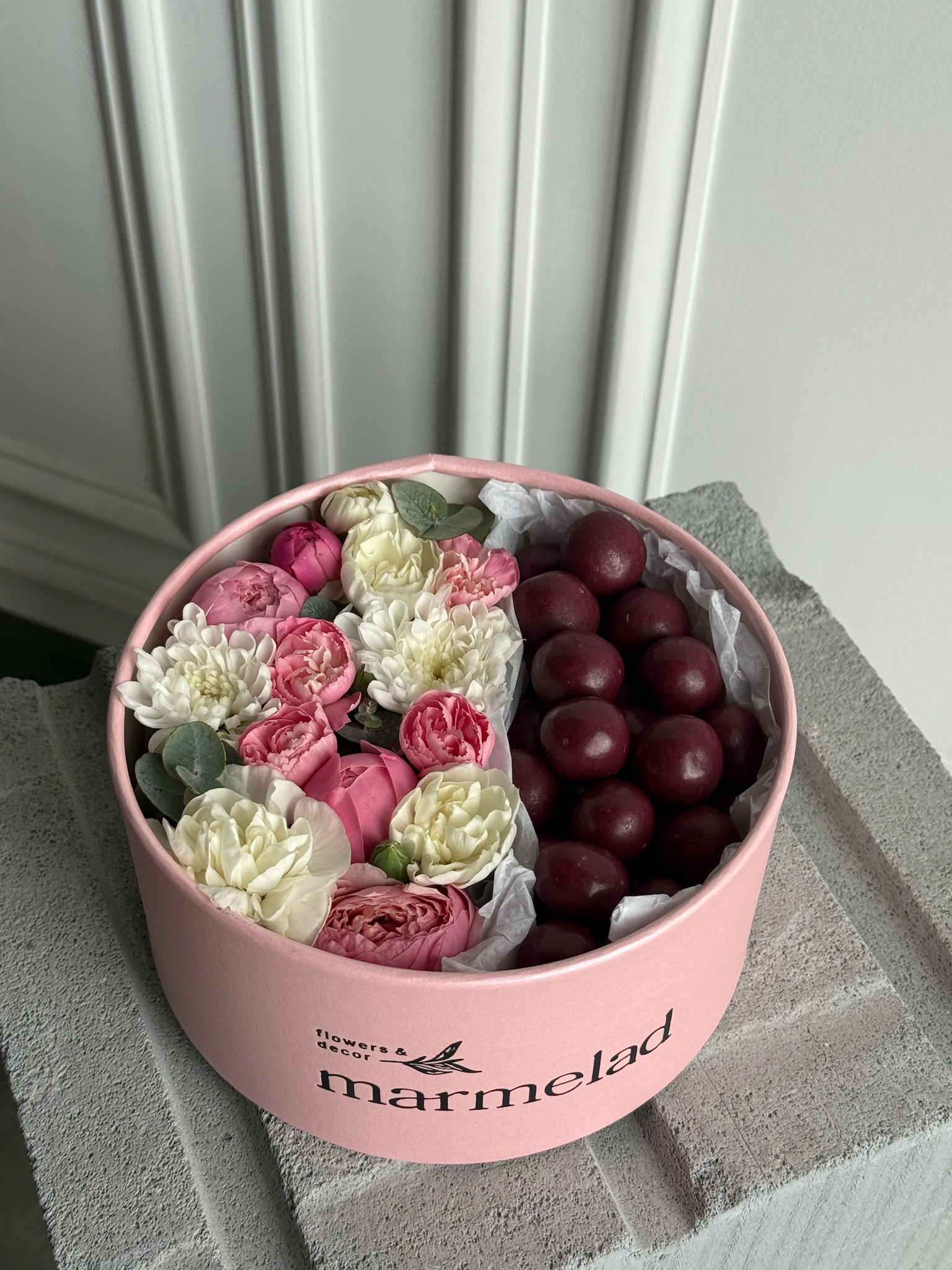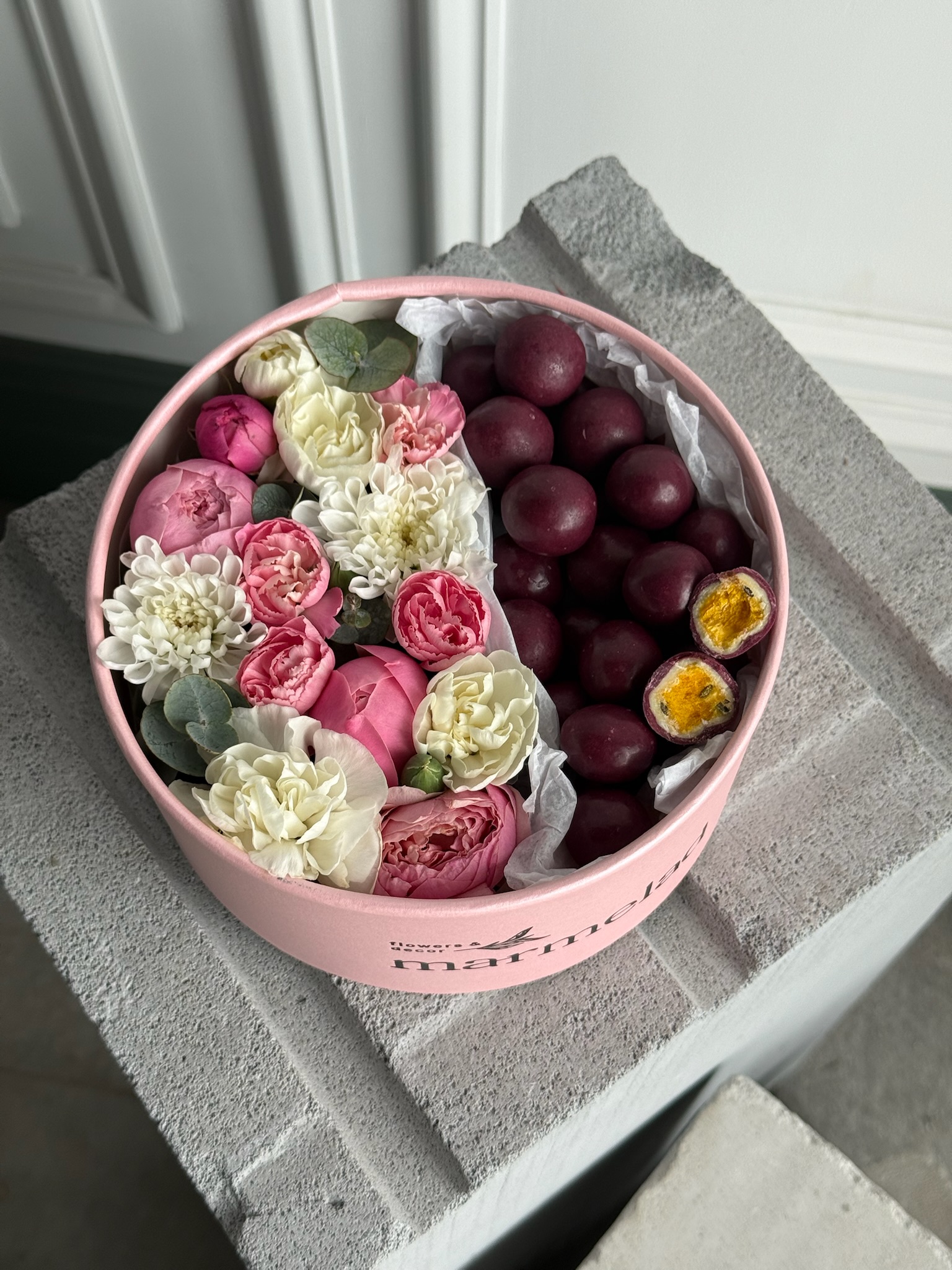 Цветочная композиция в коробке+ маракуйя в йогуртово-шоколадной глазури