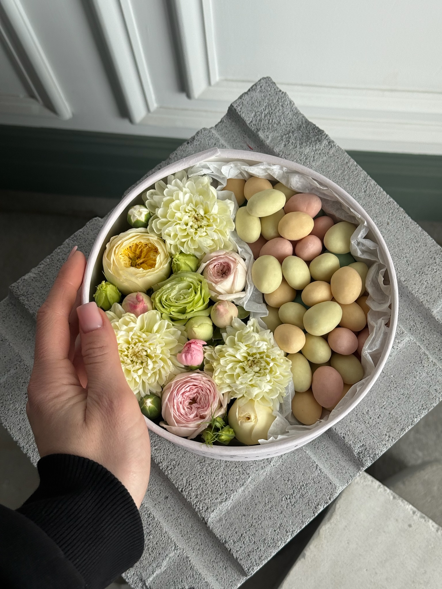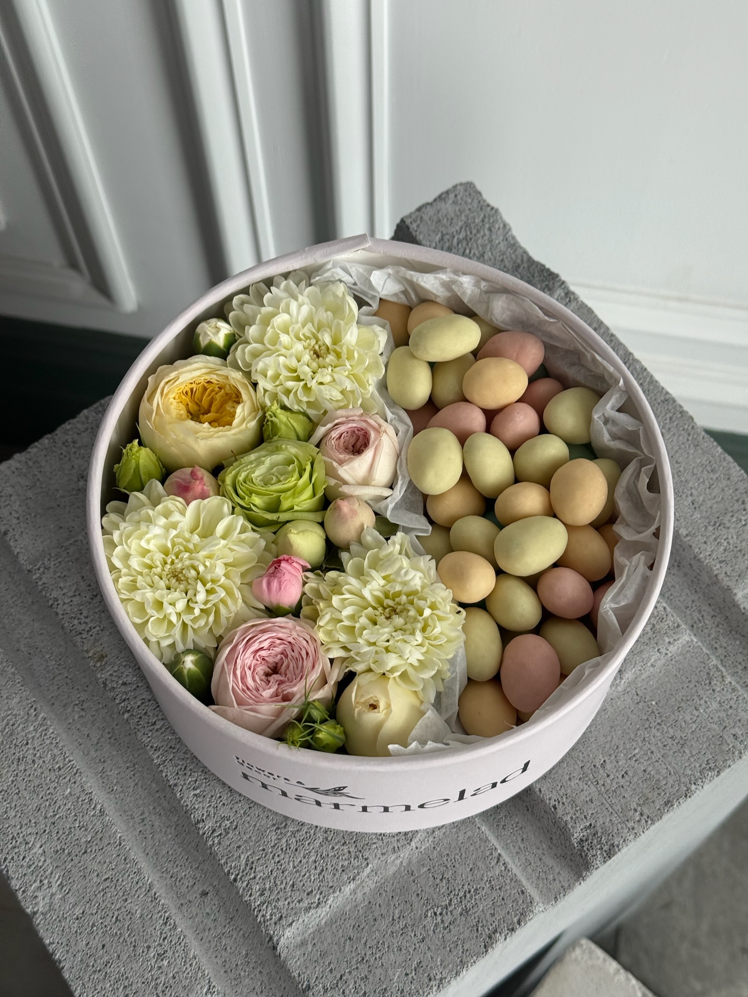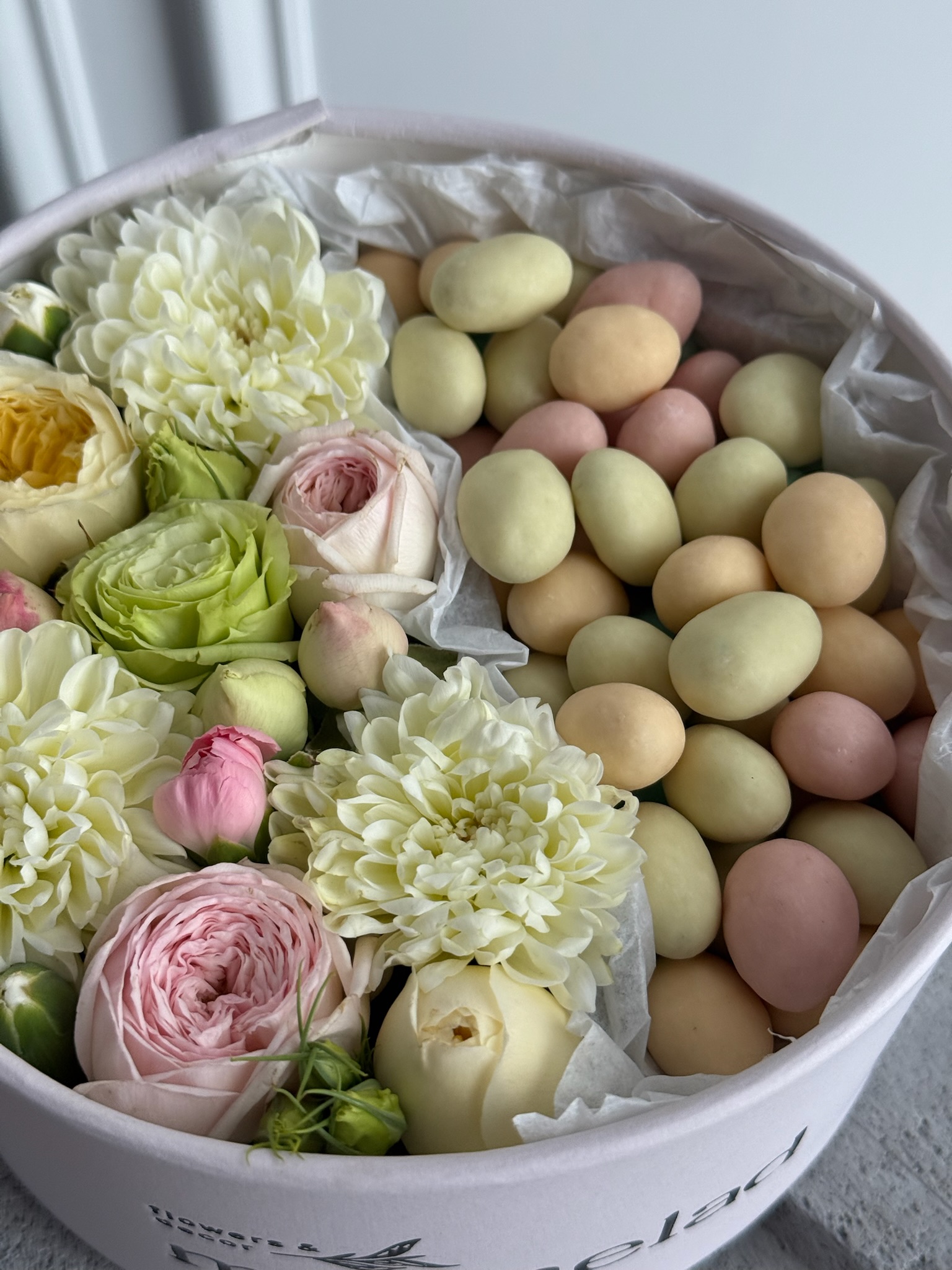 Цветочная композиция в коробке+ миндаль в белой шоколадной глазури