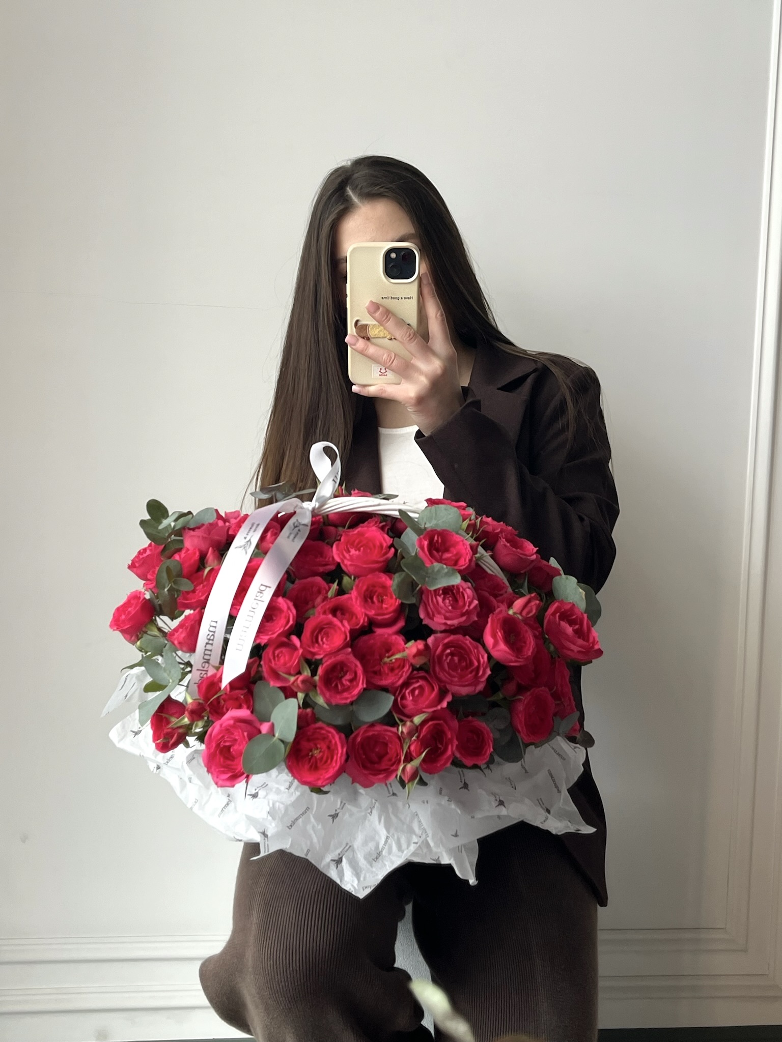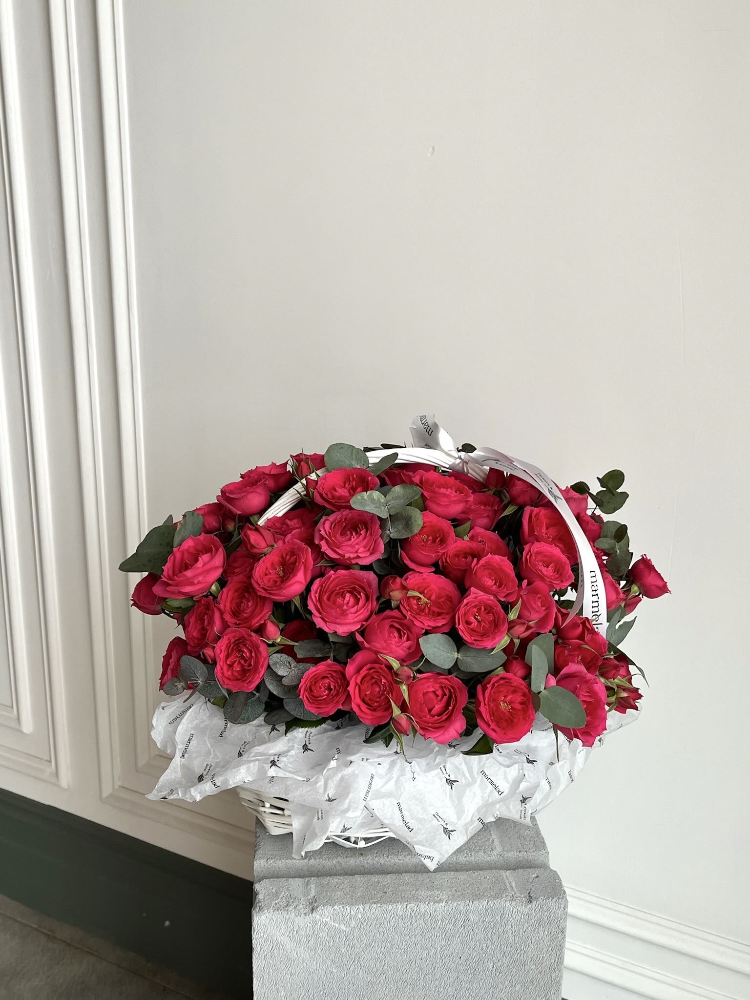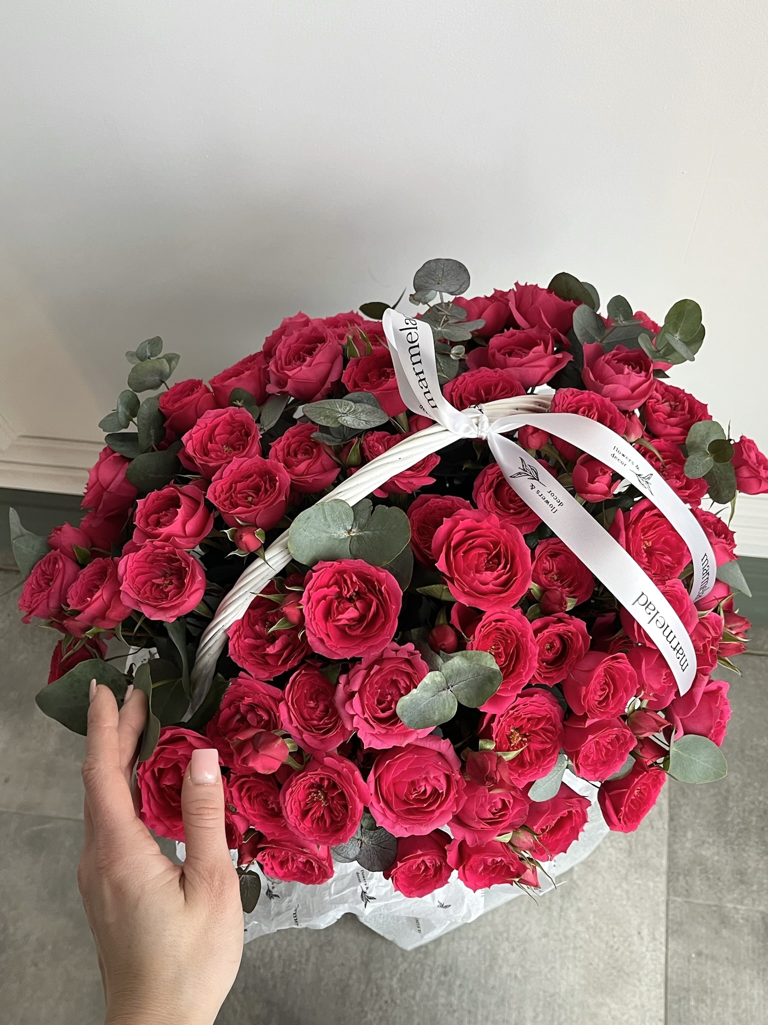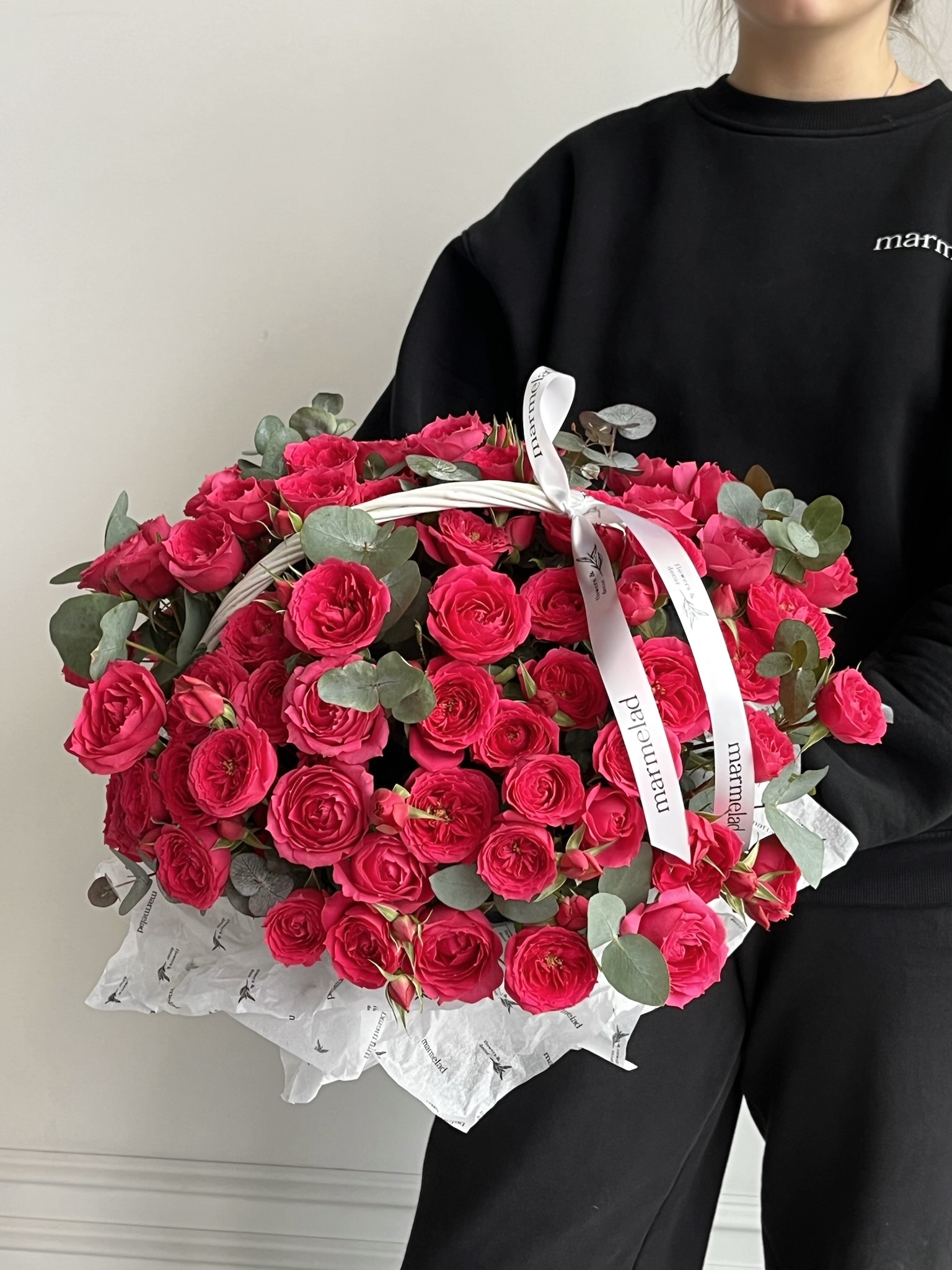 Цветочная корзина из розовых кустовых роз и эвкалипта размер M