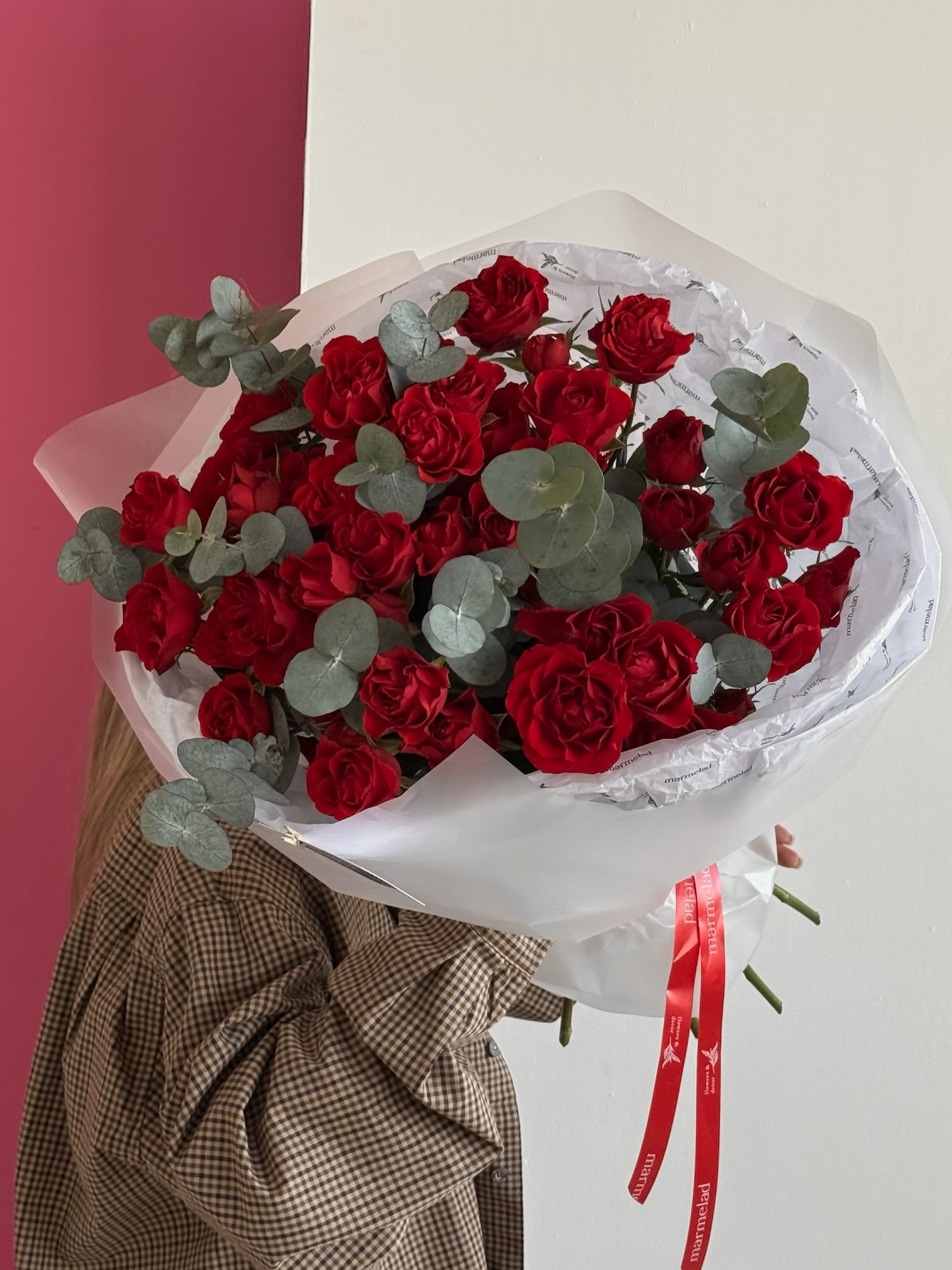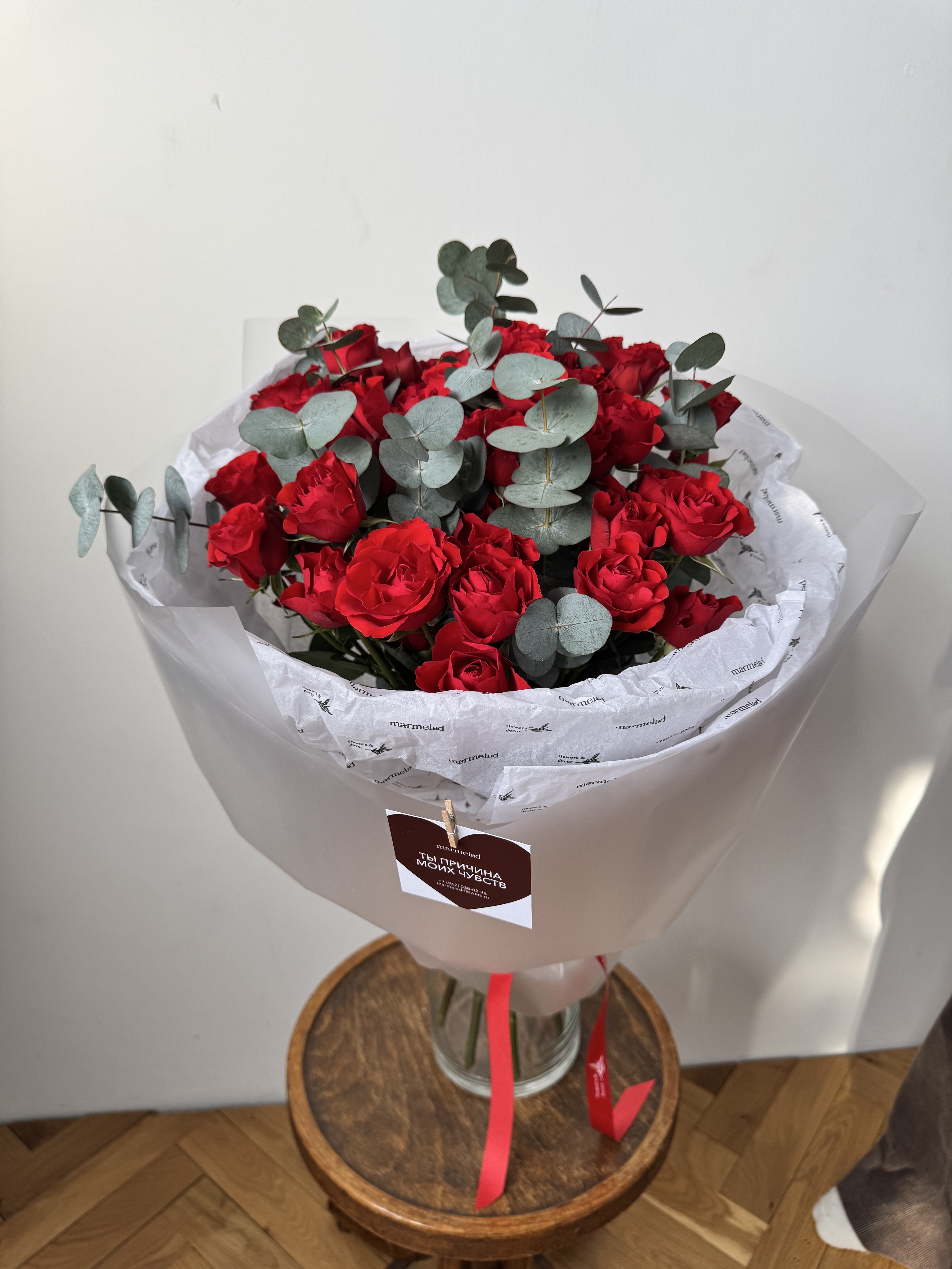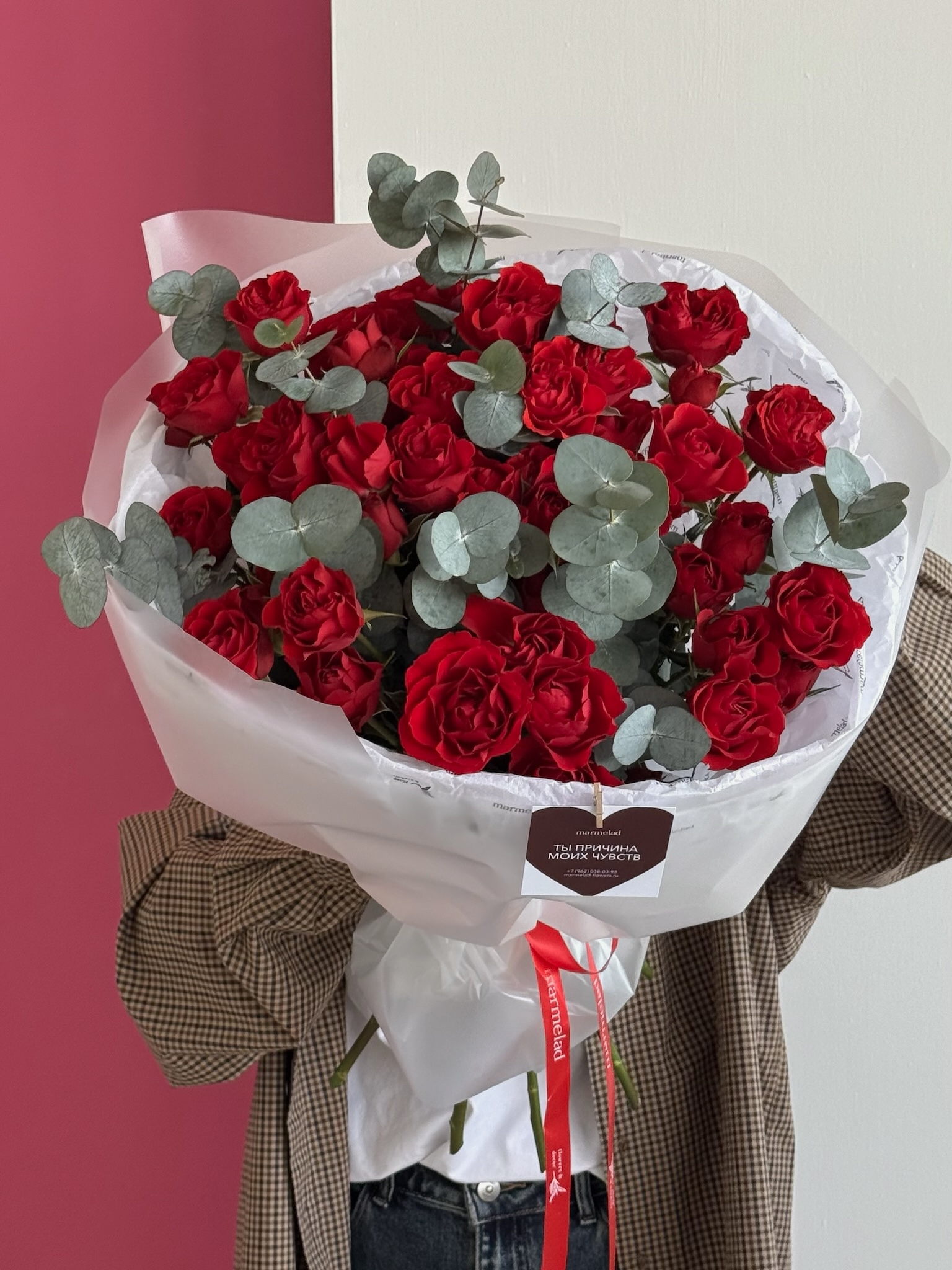Моно букет из кустовых красных роз и эвкалипта