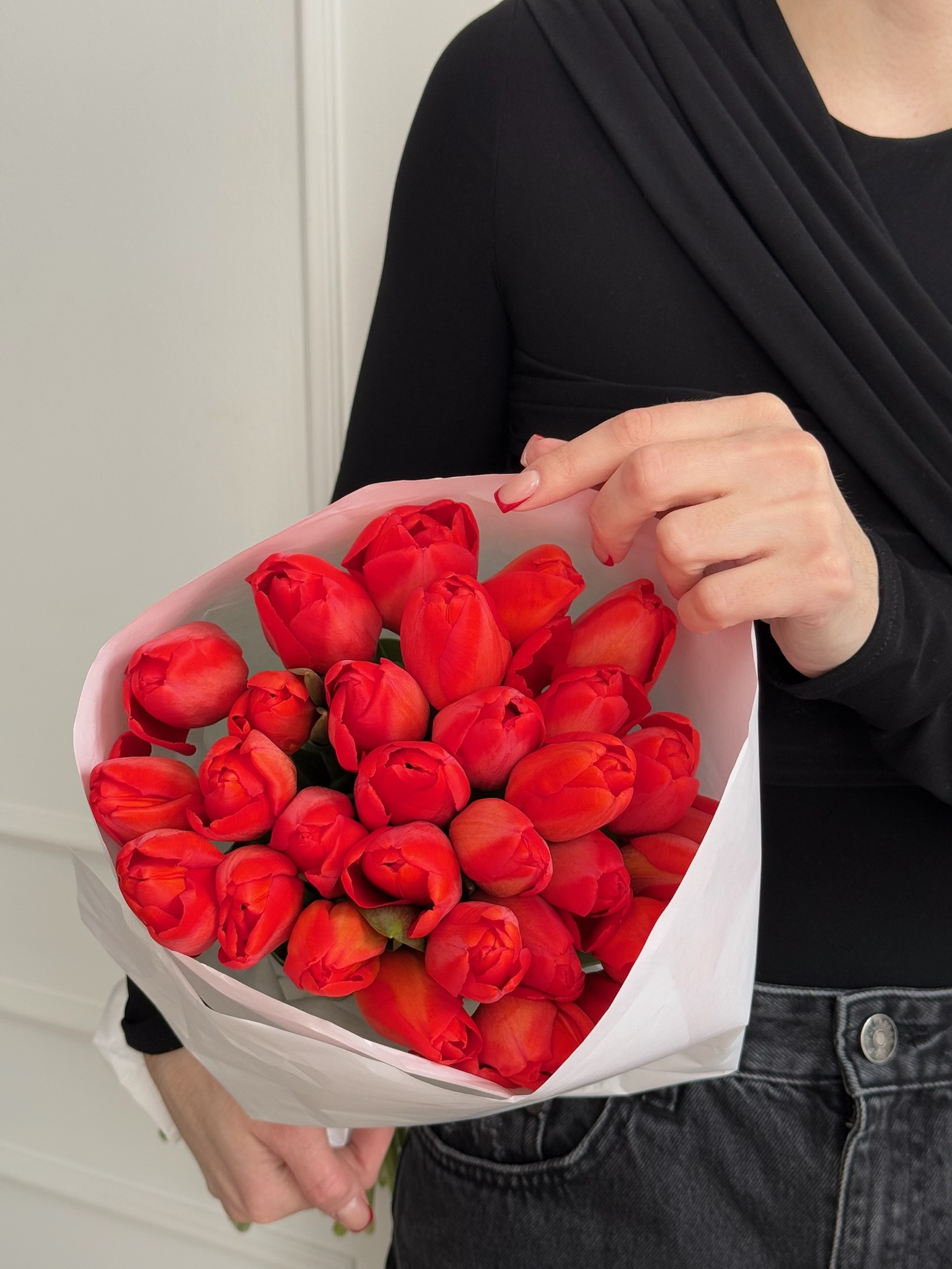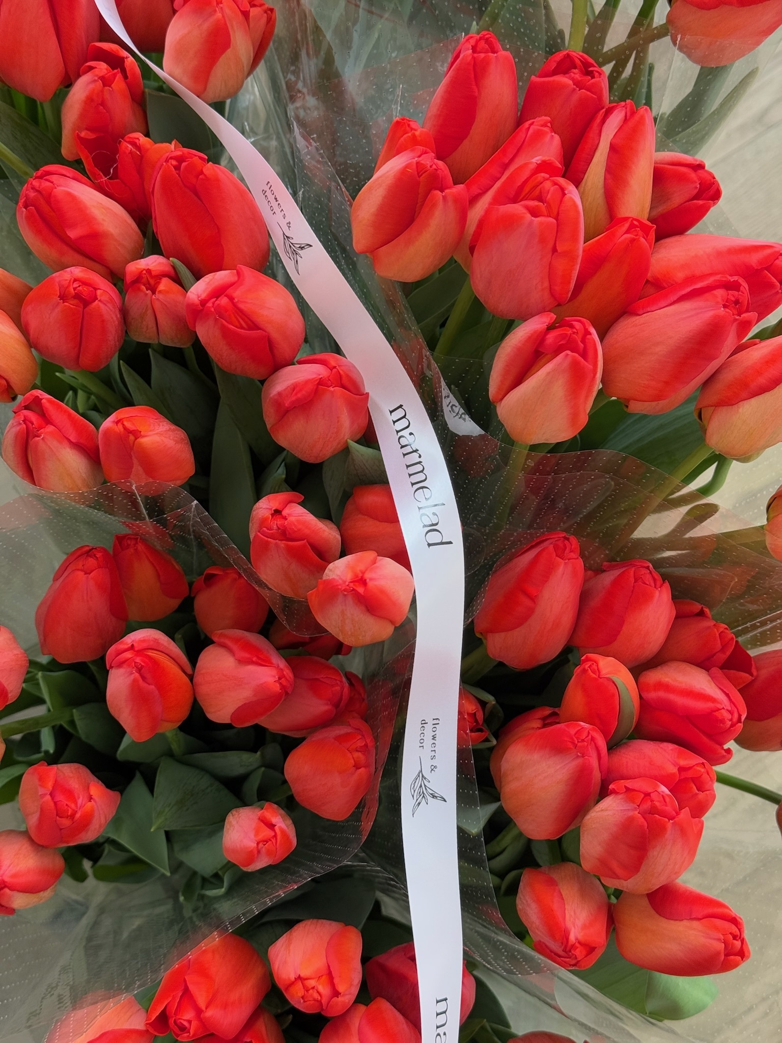 без добавления упаковки тюльпаны будут собраны в букет и перевязаны фирменной лентой в букет