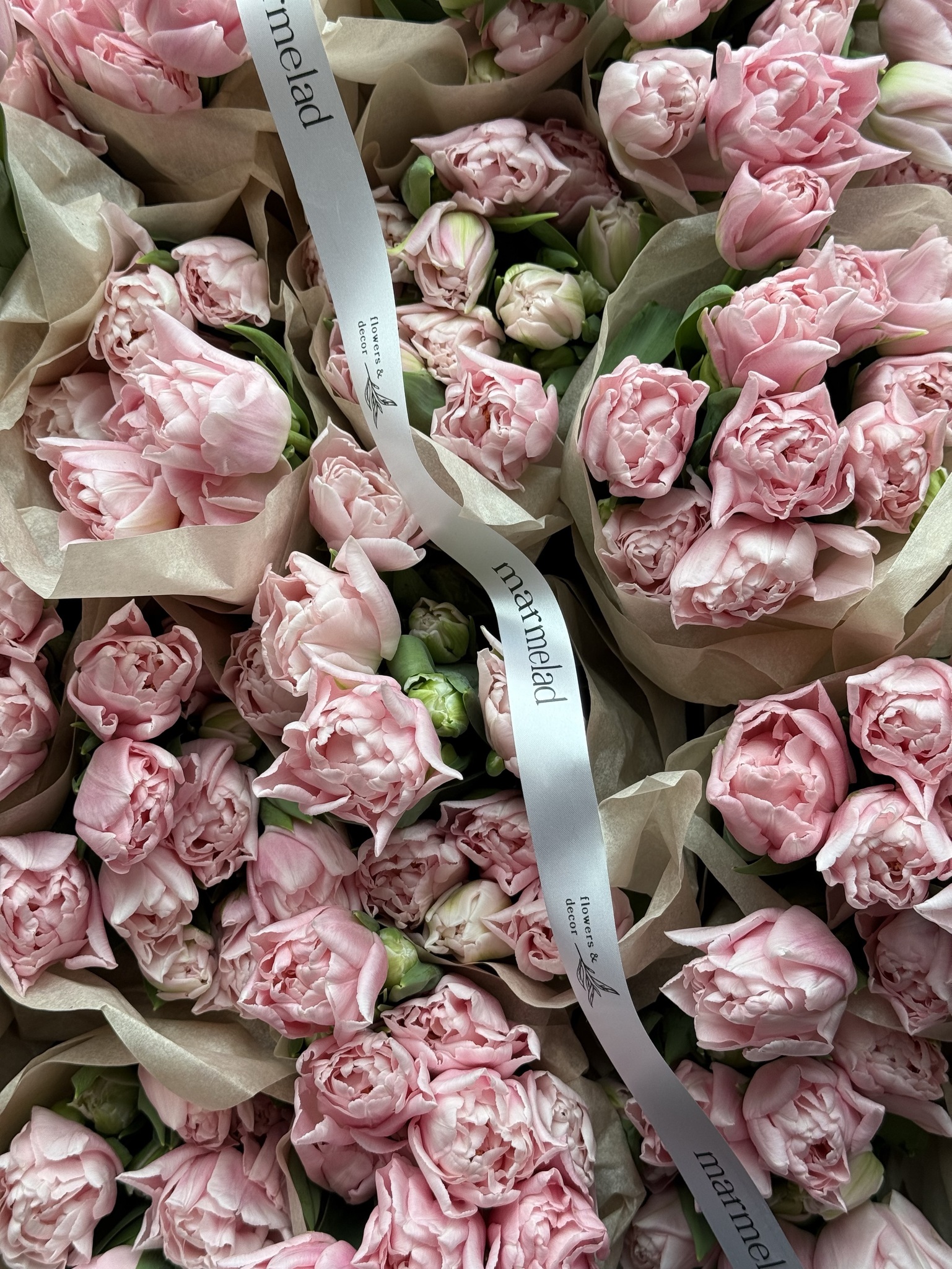 без добавления упаковки тюльпаны будут собраны в букет и перевязаны фирменной лентой в один букет