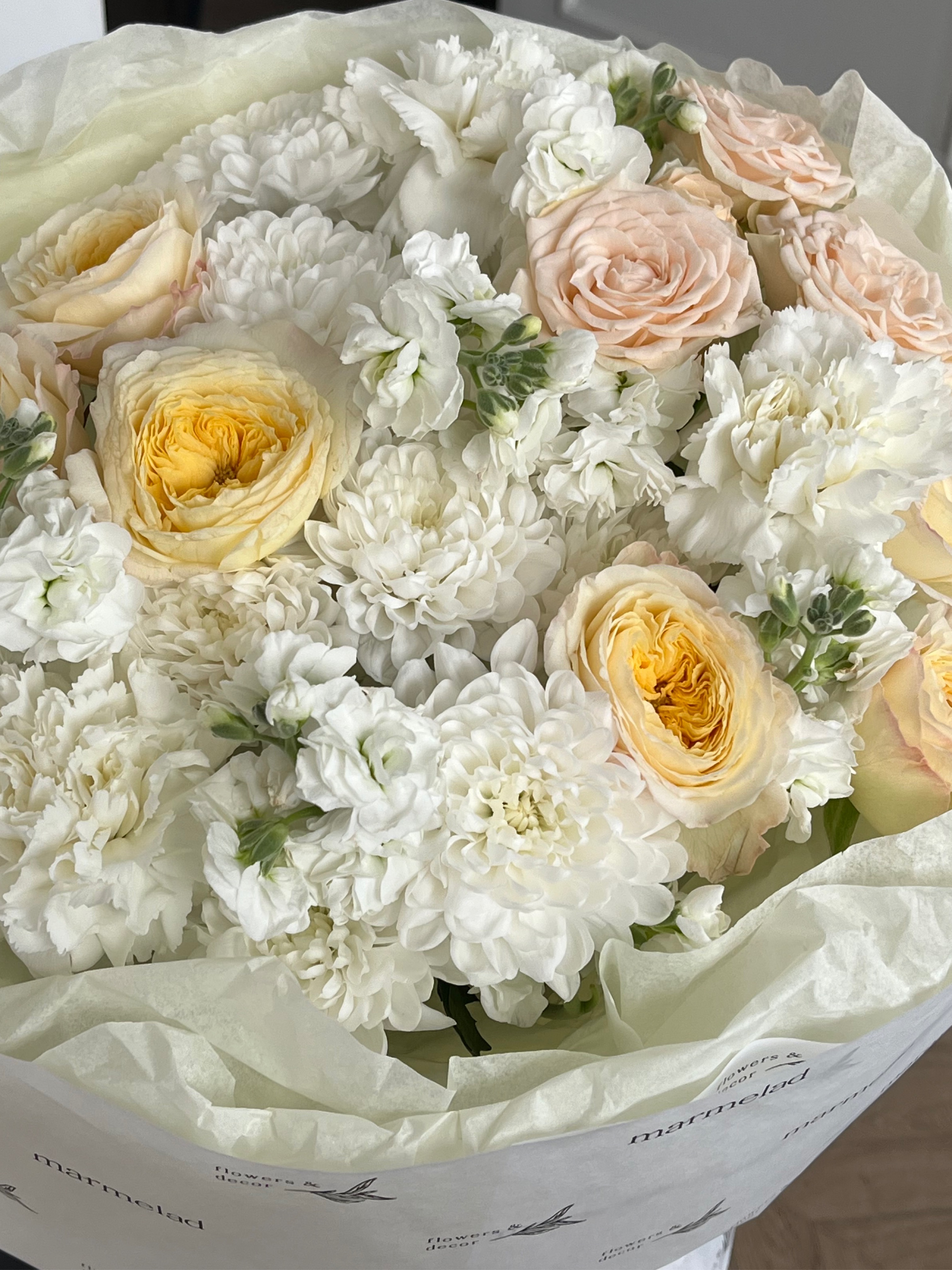 Букет из кустовых пионовидных роз, хризантемы, маттиолы и диантусов